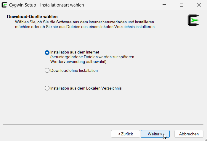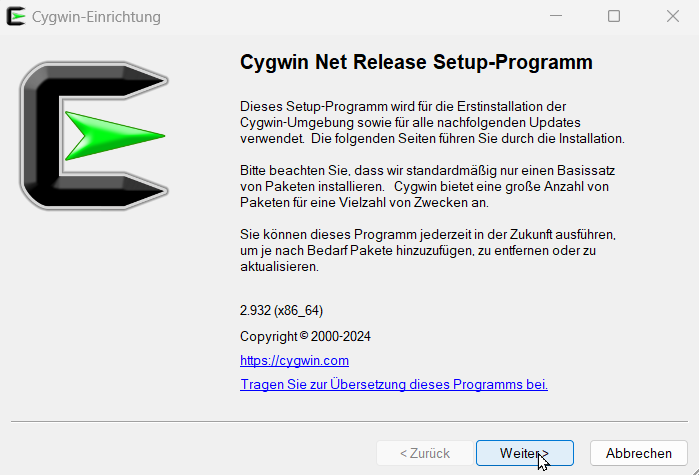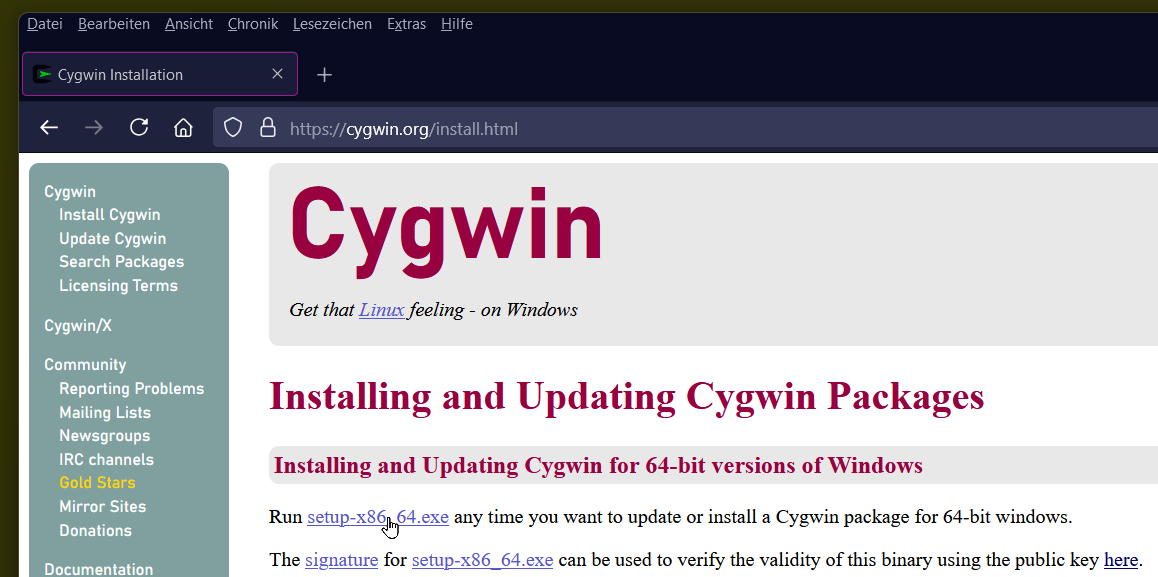 Das zur Installation erforderliche Setup-Programm findet man auf der Homepage unter dem Menüpunkt Install Cygwin. Zur Zeit (September 2024) wird die Datei setup-x86_64.exe zum Download angeboten. Das gilt für ein 64-Bit-System.
