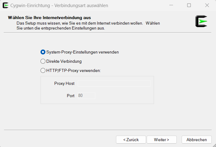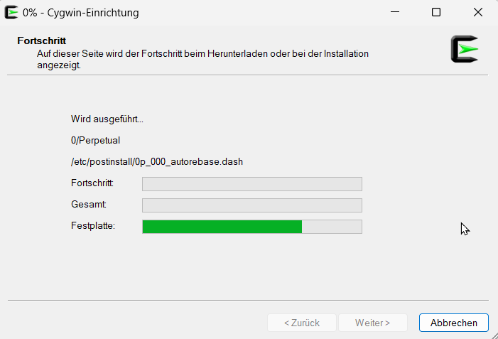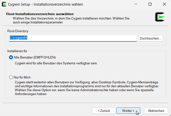 Cygwin wird durch die Installation im Laufwerk C: hinterlegt, das kann man zwar ändern, sollte es aber nur tun, wenn wirklich kein Platz mehr auf C: ist. Das Installationsverzeichnis wird vom Setup automatisch erstellt.