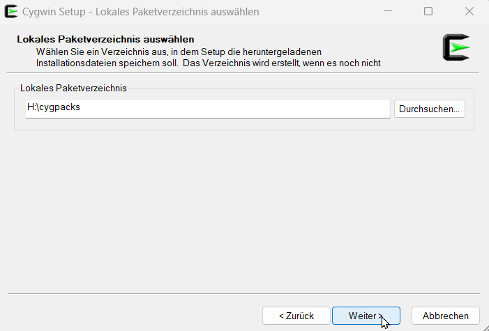 Die installierten Pakete werden im Paketverzeichnis separat gespeichert, siehe oben Hinweise unter Vorbereitung. Man trägt den vorbereiteten Pfad hier ein, danach Klick auf Weiter.